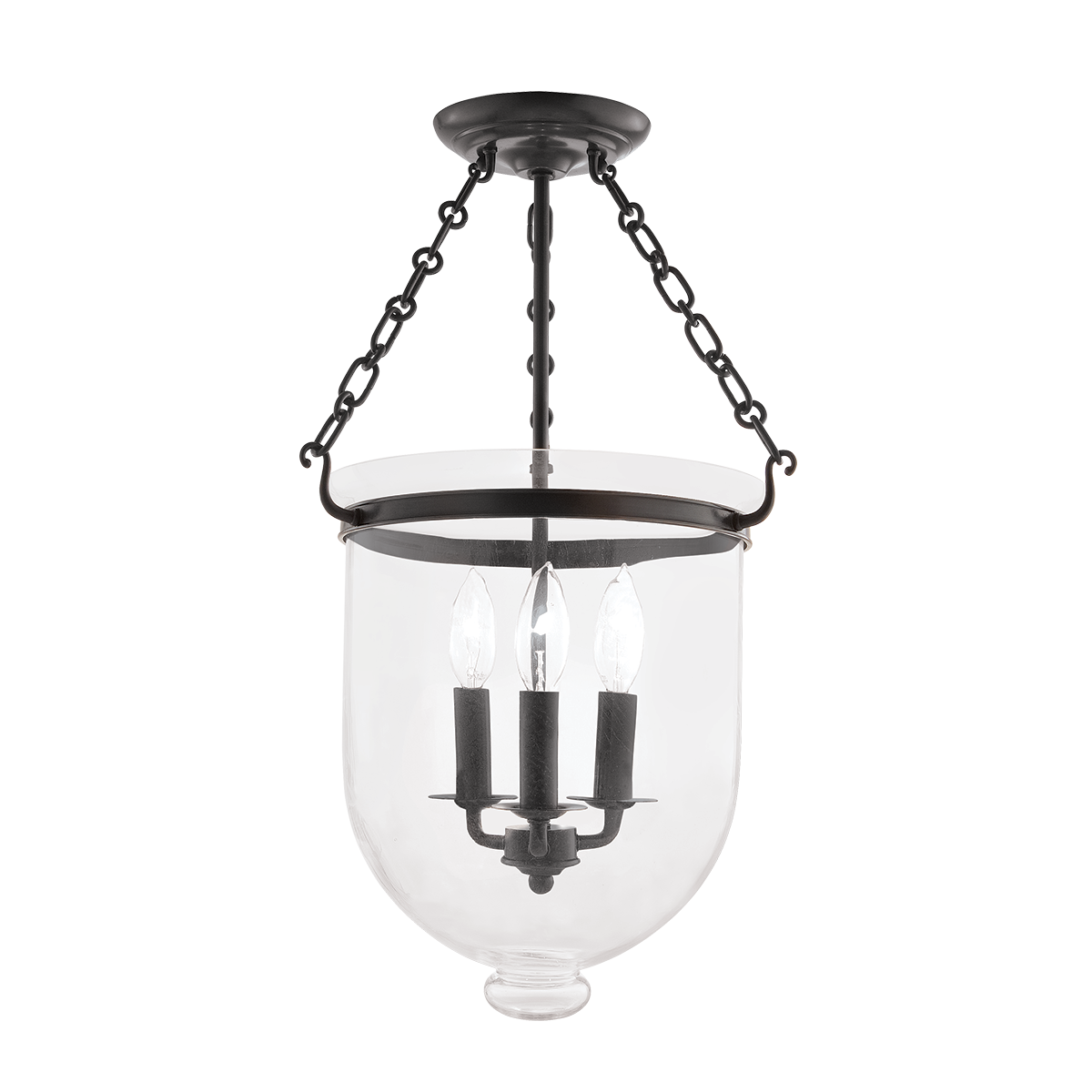 Three Light Semi Flush Mount from the Hampton collection in Old Bronze finish. In 1887, England declared an imperial holiday to commemorate Queen Victoria`s 50th year on the throne—her “golden jubilee.“ Public celebrations occurred across the empire. Photographs from India show a distinctive array of glass lanterns illuminating the occasion, representing the hybrid of Anglo and Indian design sensibilities. Hampton reproduces these historic, mouth-blown glass lanterns. While the oversized bell jar originally held a reservoir of whale oil, we suspend a candelabra array to provide warm light without the mess. The upper shade deflected the oil`s thick smoke to prevent it from staining the ceiling. Hampton comes in four metal finishes and three glass options, allowing you to customize the look to your own décor.