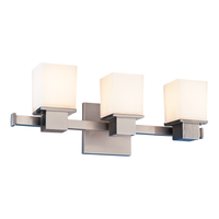 Three Light Bath Bracket from the Milford collection in Satin Nickel finish. Cubist sensibility structures the Milford sconce collection. Inspired by the 20th-century design revolution that placed purpose and material before figure and ornament, Milford brings together cast metal and blown glass to form a clean-lined luminaire with brilliant functionality that looks fantastic in any setting.