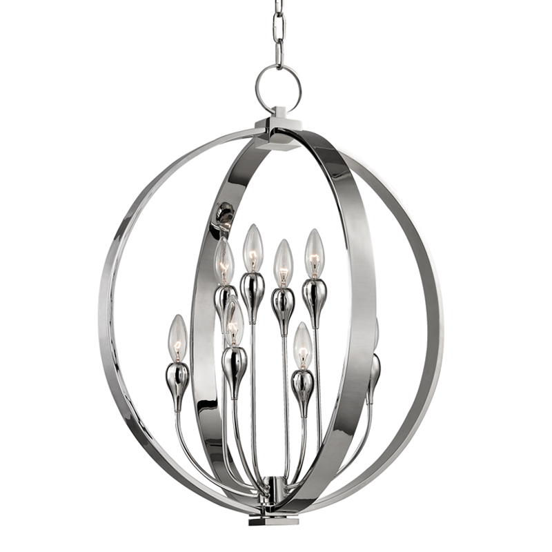 Eight Light Chandelier from the Dresden collection in Polished Nickel finish. This round piece offers our take on a perennial favorite. Arms like crocuses support candelabra bulbs, pertly poised as if reaching to the sun from within their circular metal frame. The contrast between Old Bronze and Aged Brass in our AOB versions adds further dimension to the piece.