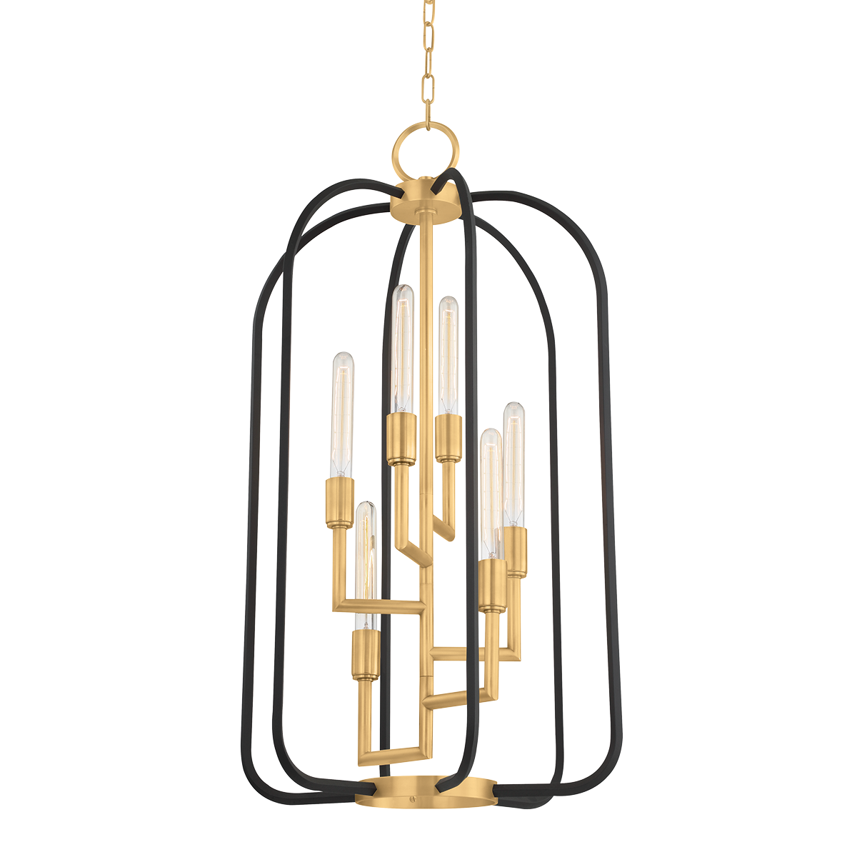 Six Light Chandelier from the Angler collection in Aged Brass finish. Using a candlestick from the fifties as an inspiration, we designed our Angler family around the idea of staggering bulbs at different heights on off-centered tubular arms bent at sharp ninety-degree angles. The resulting work is minimalist and sophisticated. Two-tone versions contrast the brass or nickel-finished candelabra with a cage of smoothly rounded black metal lines.