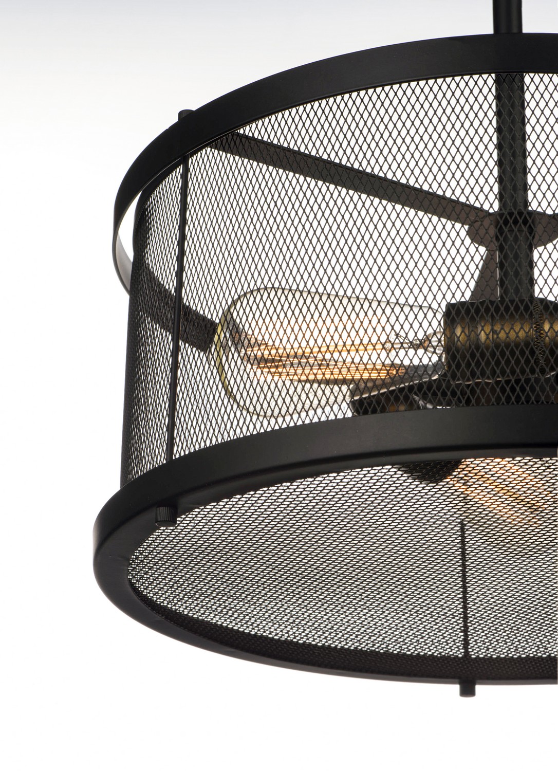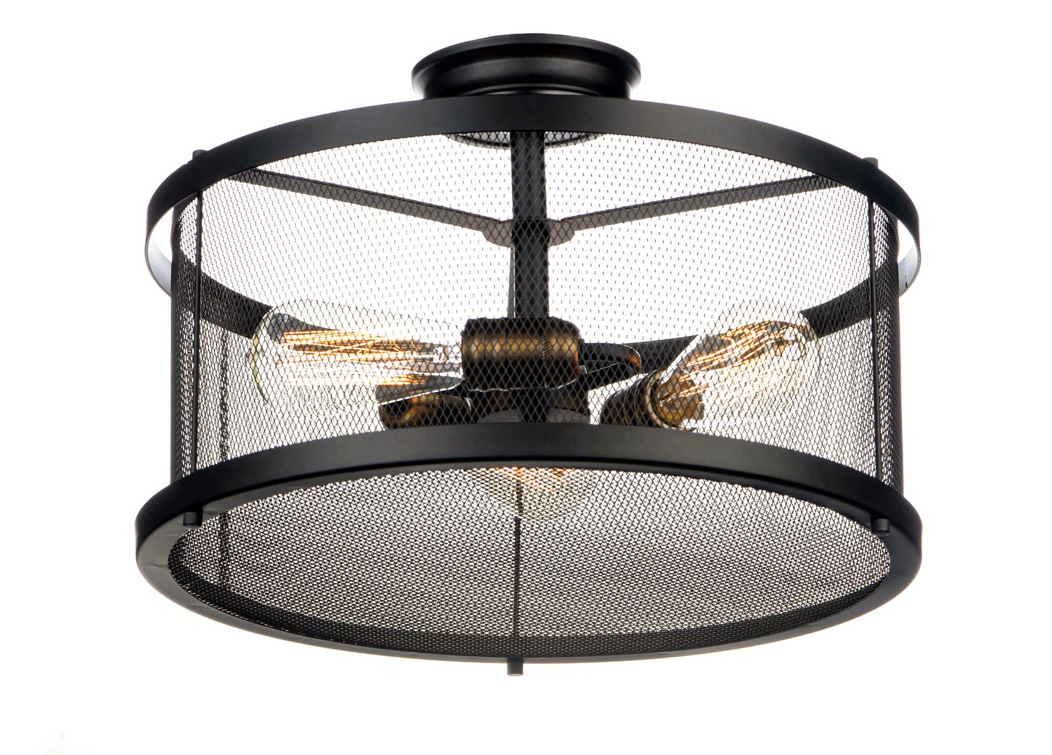 Three Light Semi-Flush Mount from the Palladium collection in Black / Natural Aged Brass finish. Popular in today’s interior design is this industrial collection featuring frames of metal mesh finished in Black and accented with cast Natural Aged Brass accents looks great with vintage carbon filament bulbs. A large variety of size and price points are provided to satisfy everyone from the discriminate designer to the building contractor.