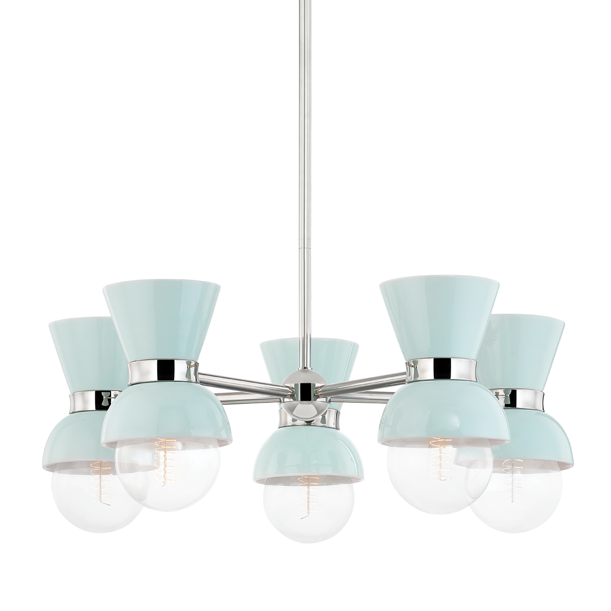 Five Light Chandelier from the Gillian collection in Polished Nickel/Ceramic Gloss Robins Egg Blue finish. Gillian brings a sense of youthfulness to a familiar form. Available in different styles, her allure lies in expertly-crafted ceramic shades. Swathed in milky hues like cream and robins egg blue, Gillian is playfully elegant. Metal accents heat things up, making Gillian a contender for any modern interior.