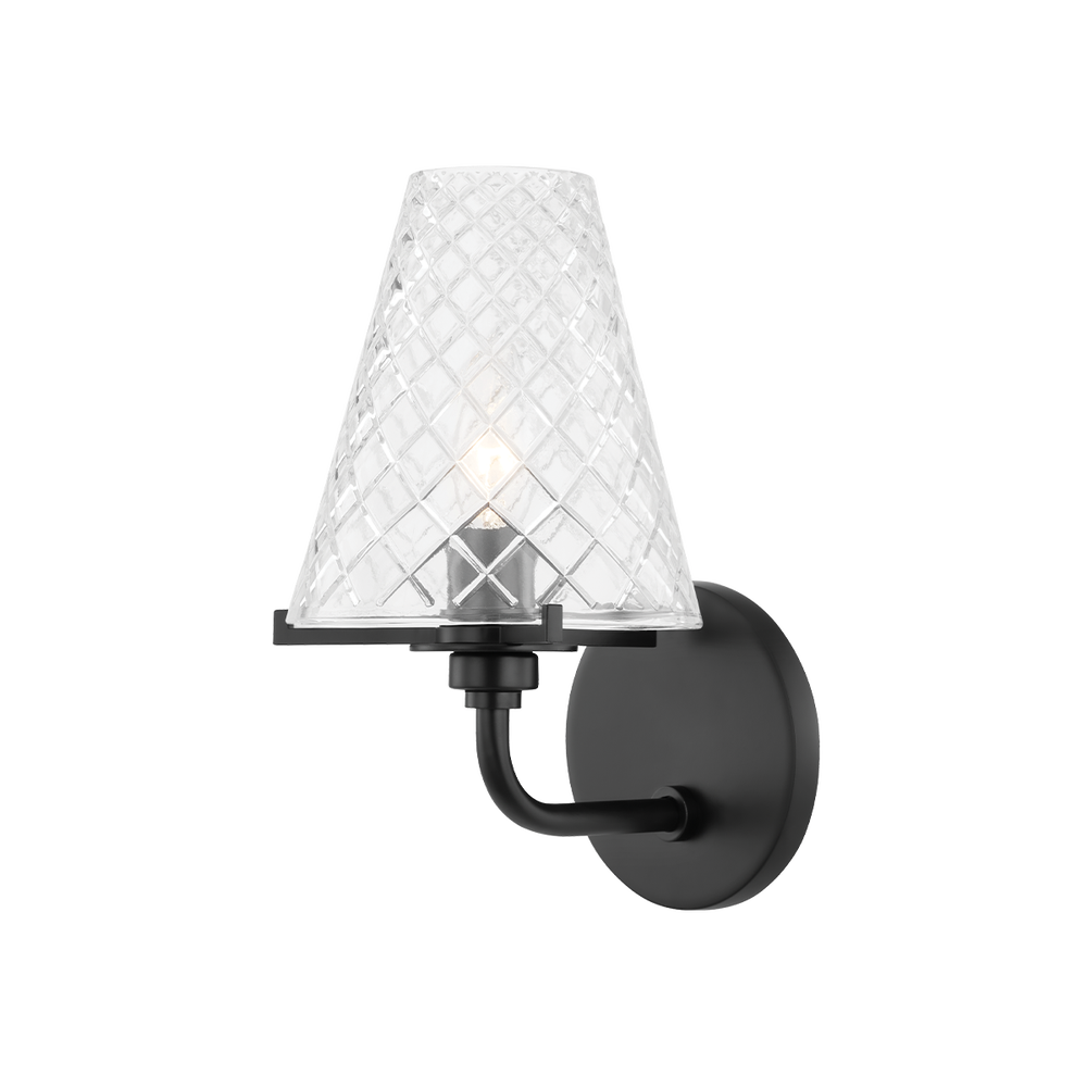 One Light Bath and Vanity from the Irene collection in Soft Black finish. Convince friends you scoured the local vintage scene to score Irene`s legendary looks. Patterned glass inspired by early 20th century motifs adds a touch of romance while modern metalwork keeps the design grounded for decades to come. Available in multiple styles, sizes, and finishes, Irene could adorn a retro bath, bar or kitchen island.