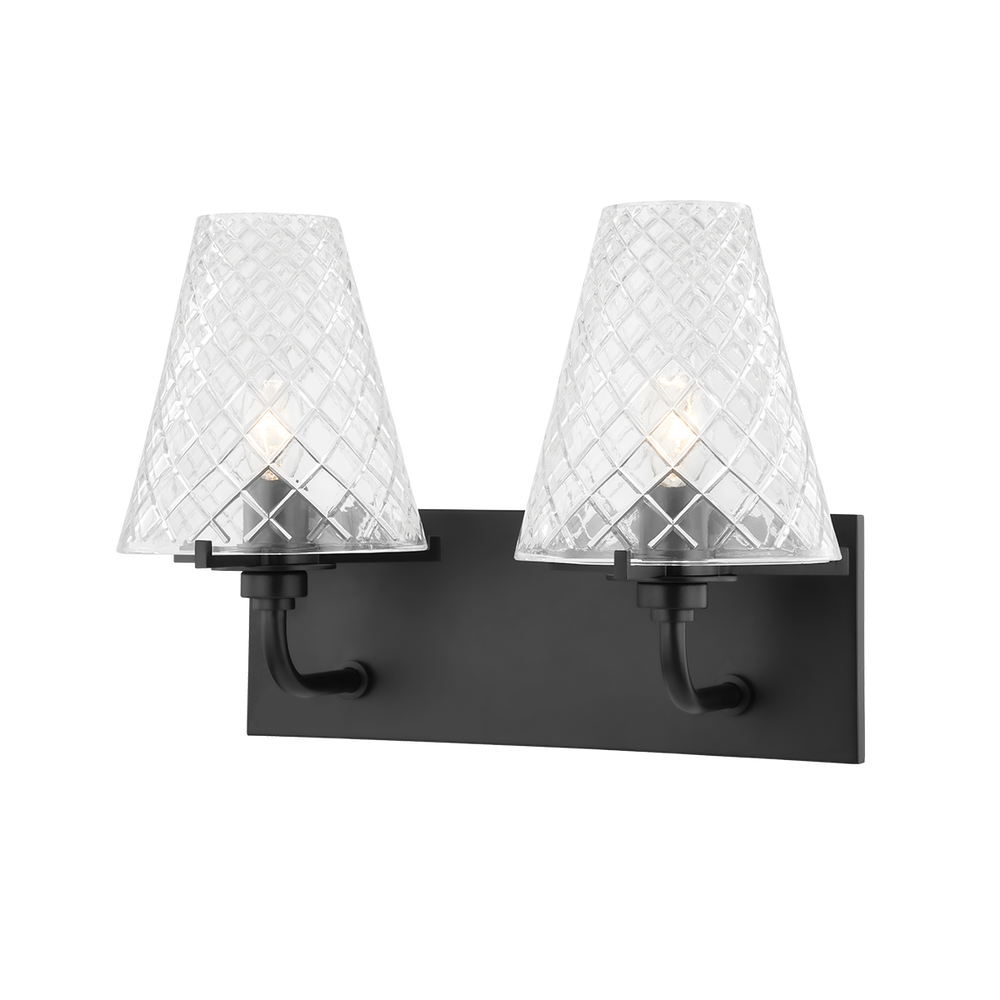 Two Light Bath and Vanity from the Irene collection in Soft Black finish. Convince friends you scoured the local vintage scene to score Irene`s legendary looks. Patterned glass inspired by early 20th century motifs adds a touch of romance while modern metalwork keeps the design grounded for decades to come. Available in multiple styles, sizes, and finishes, Irene could adorn a retro bath, bar or kitchen island.