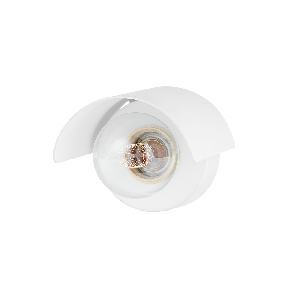 One Light Wall Sconce from the Malia collection in Aged Brass/Soft White finish. Malia gives off a vintage vibe with an industrial edge. A thick aged brass backplate holds a single exposed bulb that emits a clear, bright light. A smooth, curved shade in aged brass, soft black or soft white covers the bulb and a warm glow reflects off aged brass on the underside. This simple sconce adds big style without taking up a lot of space.