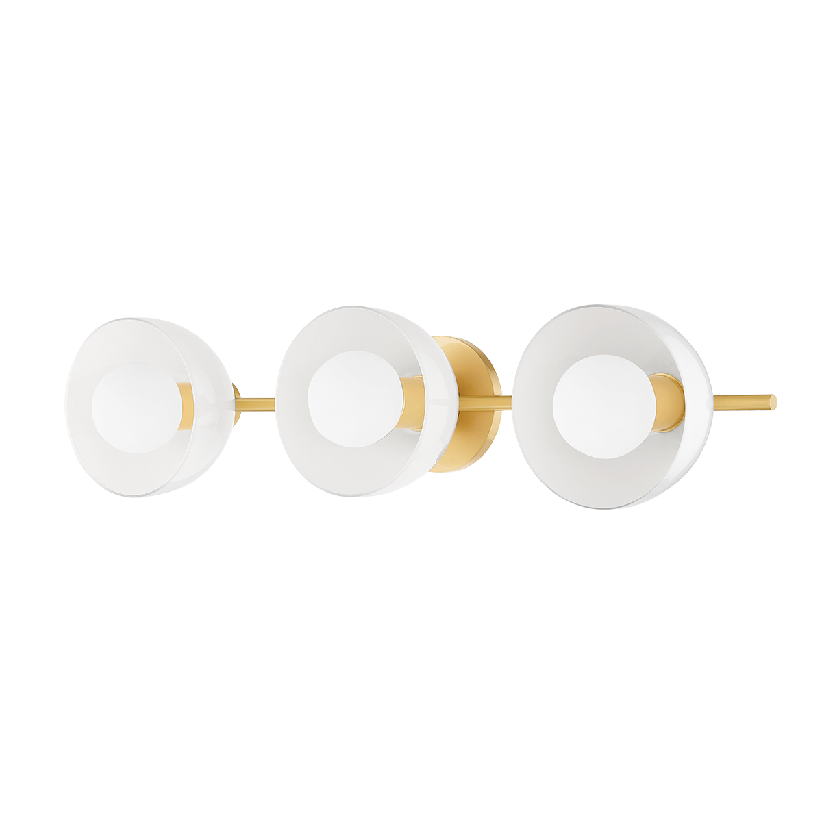Three Light Bath and Vanity from the Belle collection in Aged Brass finish. Cool contrast and fine form play well together in Belle’s striking silhouette. The aged brass frame pops against the glossy white shades, featuring exposed bulbs for a futuristic effect. This 3-light bath sconce can be installed vertically or horizontally.
