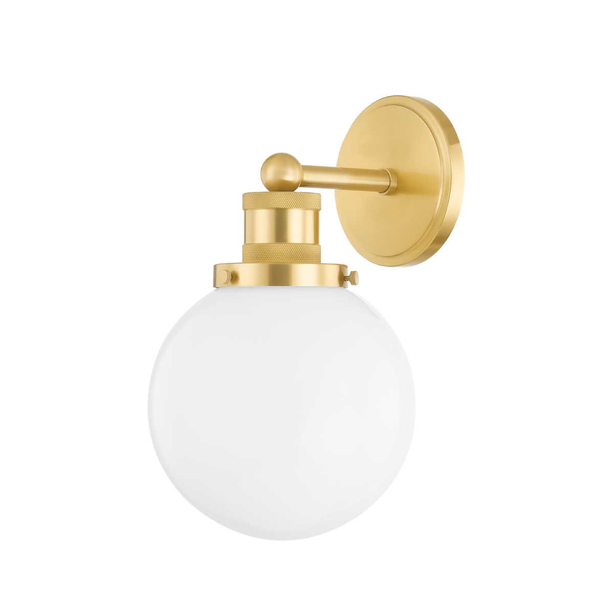 One Light Wall Sconce from the Beverly collection in Aged Brass finish. Simply captivating, the Beverly wall sconce and pendant could easily reside in a Victorian revival or modern loft. Inspired by American heritage design at the turn of the 20th century, Beverly is a timeless classic. Available in aged brass, old bronze, and polished nickel, Beverly is great for spaces where repetition is needed, like down a hallway or lining the walls of a bathroom.