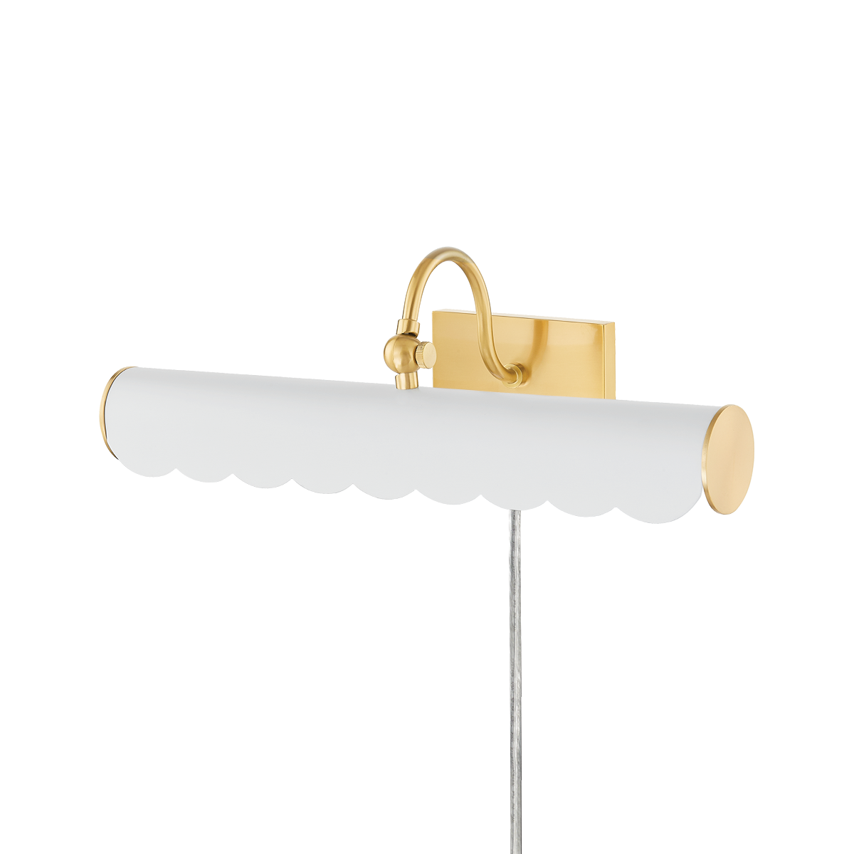Two Light Picture Light from the Fifi collection in Aged Brass finish. Highlight artwork, photos or other wall d��cor with this pretty, plug-in picture light. A new traditional take on the classic design, it features a sweet scalloped edge and curved arm that adds warmth and feels fresh. Fifi is available in three sizes and finishes, Aged Brass, Soft White, and Soft Navy to fit any space and color scheme. Part of our Ariel Okin x Mitzi Tastemakers collection.