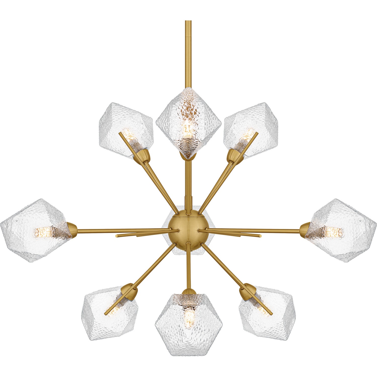 Nine Light Chandelier from the Salvador collection in Brushed Gold finish. The Salvador collection showcases an updated Sputnik design with a modern twist, featuring crystal-like faceted glass that adds a touch of sophistication and brilliance. Available as both a semi-flush mount and a chandelier, this collection offers versatile options to enhance various spaces. With sharp angles and a choice of brushed gold or earth black finishes, Salvador provides a striking visual appeal – perfect for making a statement in dining rooms, living areas, or entryways.