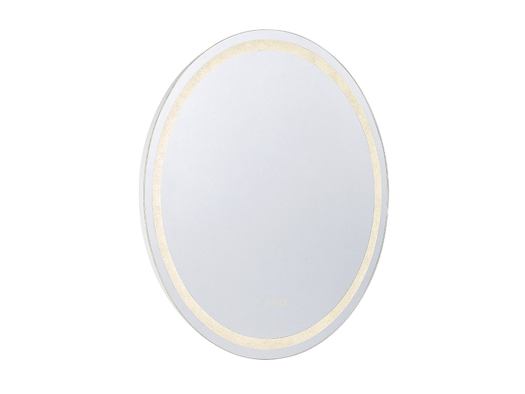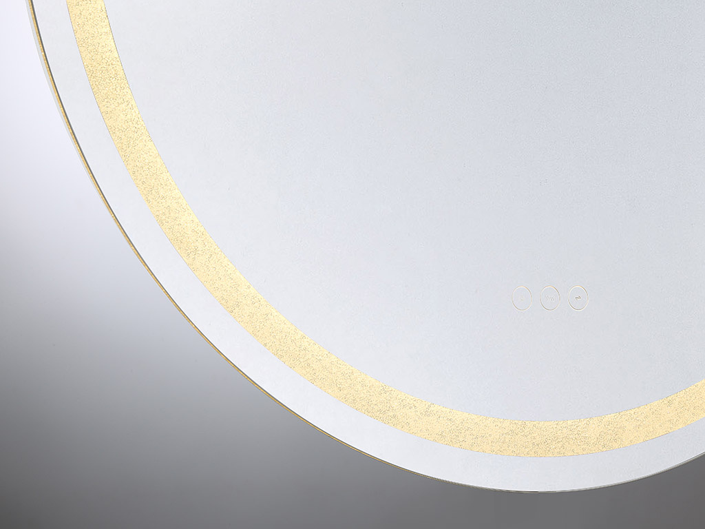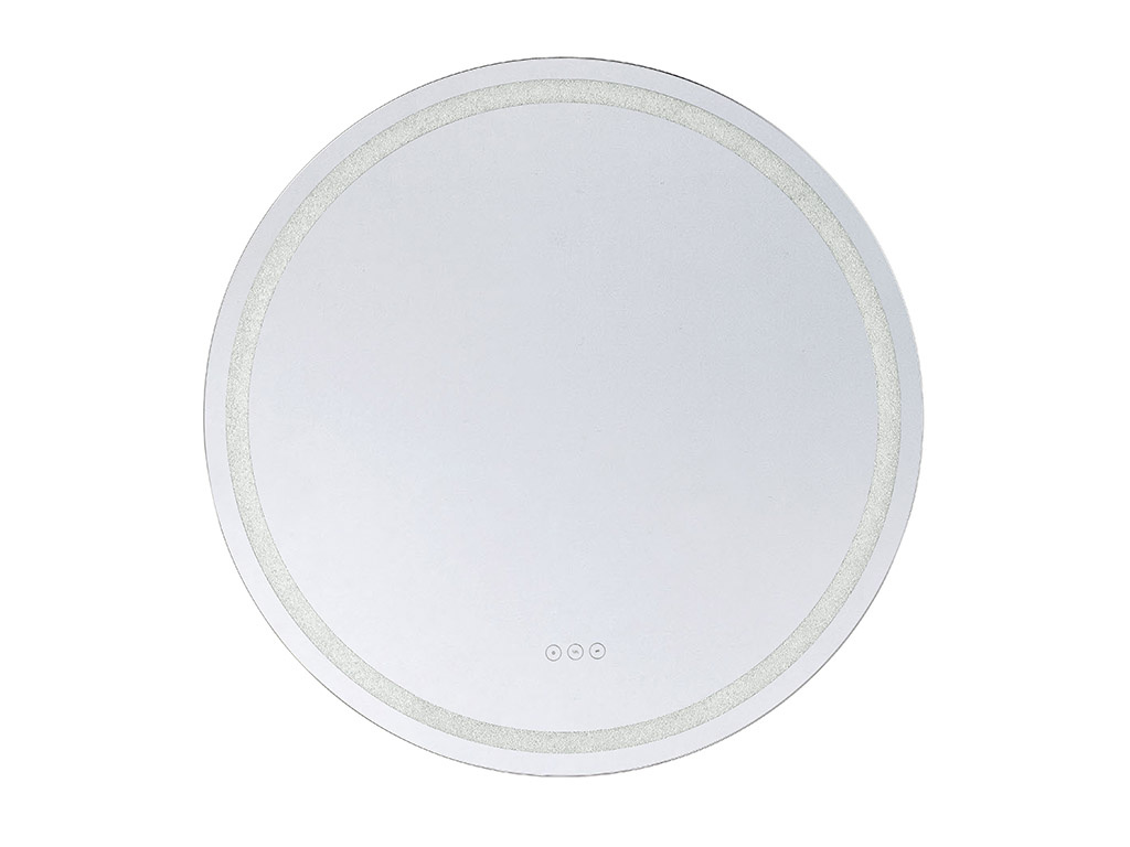 LED Mirror from the Cordova collection. Lovers of glamorous style will find their perfect match in this Savoy House Cordova round front lit LED mirror! Marvel at the thousands of tiny crushed crystals embedded in the frame that add sparkle to the space, whether the light is on or off, and find convenient controls right at your fingertips. Choose from three different color temperatures – 3000K, 4500K and 6500K – to get the glow that is right for you. Use the stepless dimmer to increase or decrease the brightness. Keep things clear with the defogger, which shuts off automatically after one hour. Cordova even remembers and recalls the last used illumination setting! This mirror is free from lead and copper, comes with mounting hardware and is backed by a 3-year warranty. Uses 41 watts to deliver 816 lumens at a CRI of 90+. Suitable for damp locations. Cordova is 32″ in diameter and extends 1.88″ from the wall.