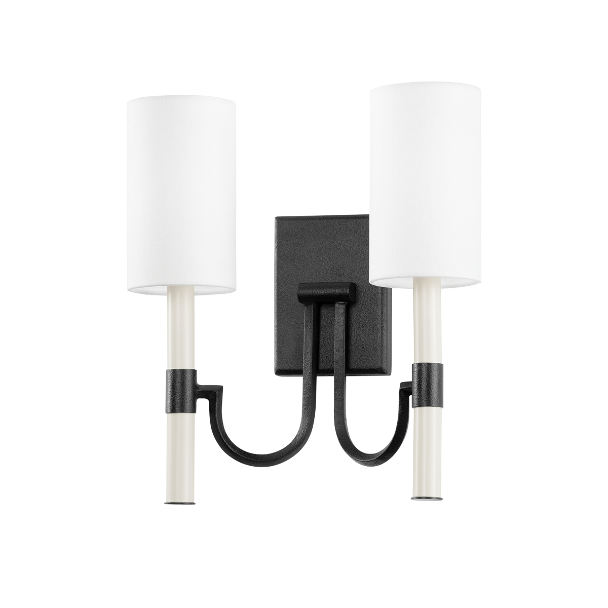 Two Light Wall Sconce from the Gustine collection in For finish. Graceful downward sweeping arms straighten and extend into square metal accent tubes that hold cream-colored candle sleeves, creating an elegant look that is effortlessly useable. Both finishes add texture, with the Vintage Gold Leaf bringing warmth and the Forged Iron a more dramatic feel. The sconce and the chandelier are each available in two sizes and both finishes to fit any interior space.