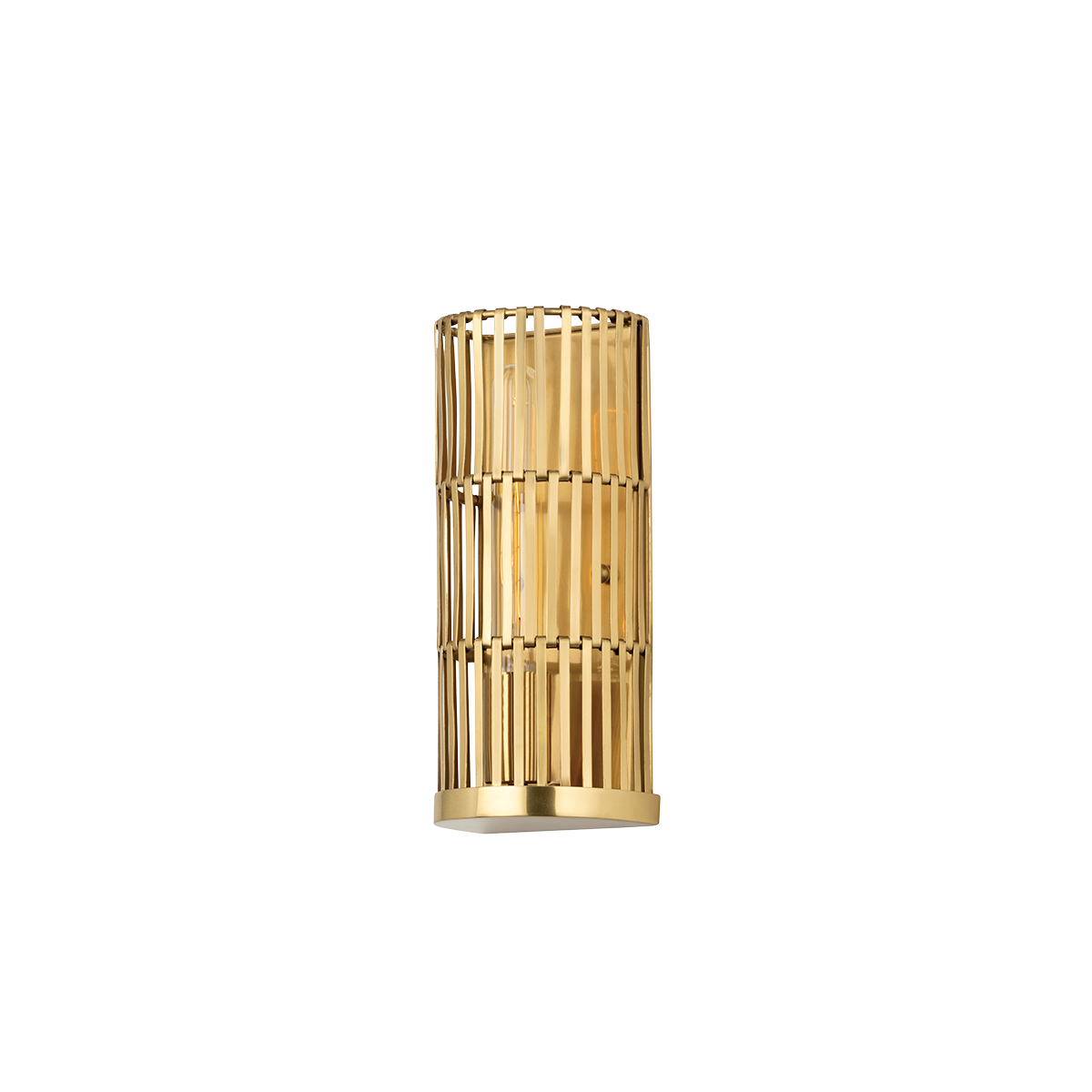 One Light Wall Sconce from the Adair collection in Patina Brass finish. Strips of Patina Brass are intricately woven around a metal framework creating a delicate cage-like silhouette and giving this sconce its luxe look. Light flows through and reflects off the metal strips and backplate for a brilliant sparkling effect. The one-light sconce works well in smaller spaces and the two-light version provides both uplight and downlight.