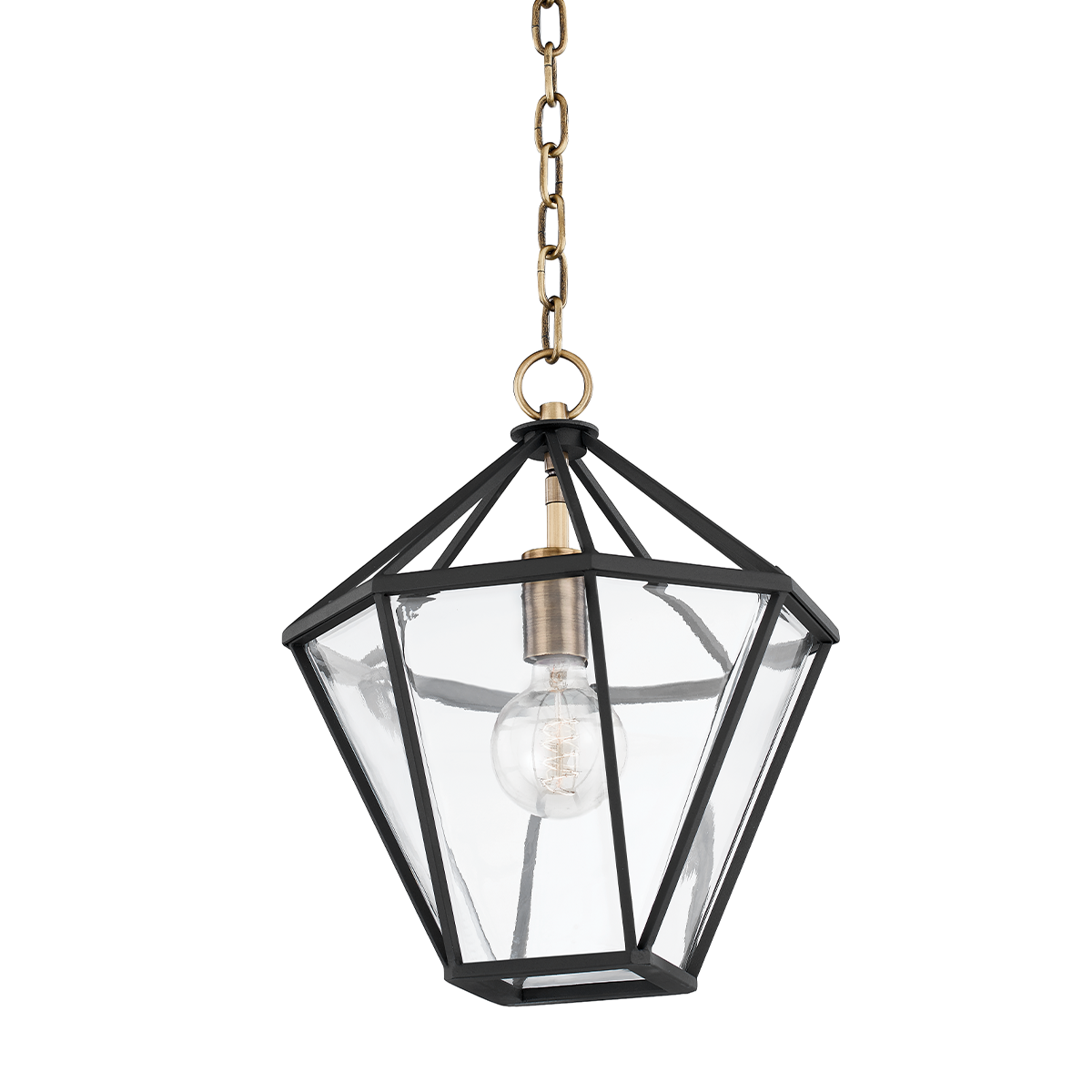 One Light Lantern from the Moss collectionMoss is a fresh take on traditional lanterns. A series of glass panels are held in place by textured black metal to form a unique hex silhouette. Wavy clear glass breaks apart and refracts the light beautifully. A clear bulb in a patina brass socket floats within the frame and fills it with a stunning glow. Whether kept close to the ceiling as a flush mount or hanging lower as a pendant, Moss will add a graceful elegance to any space.